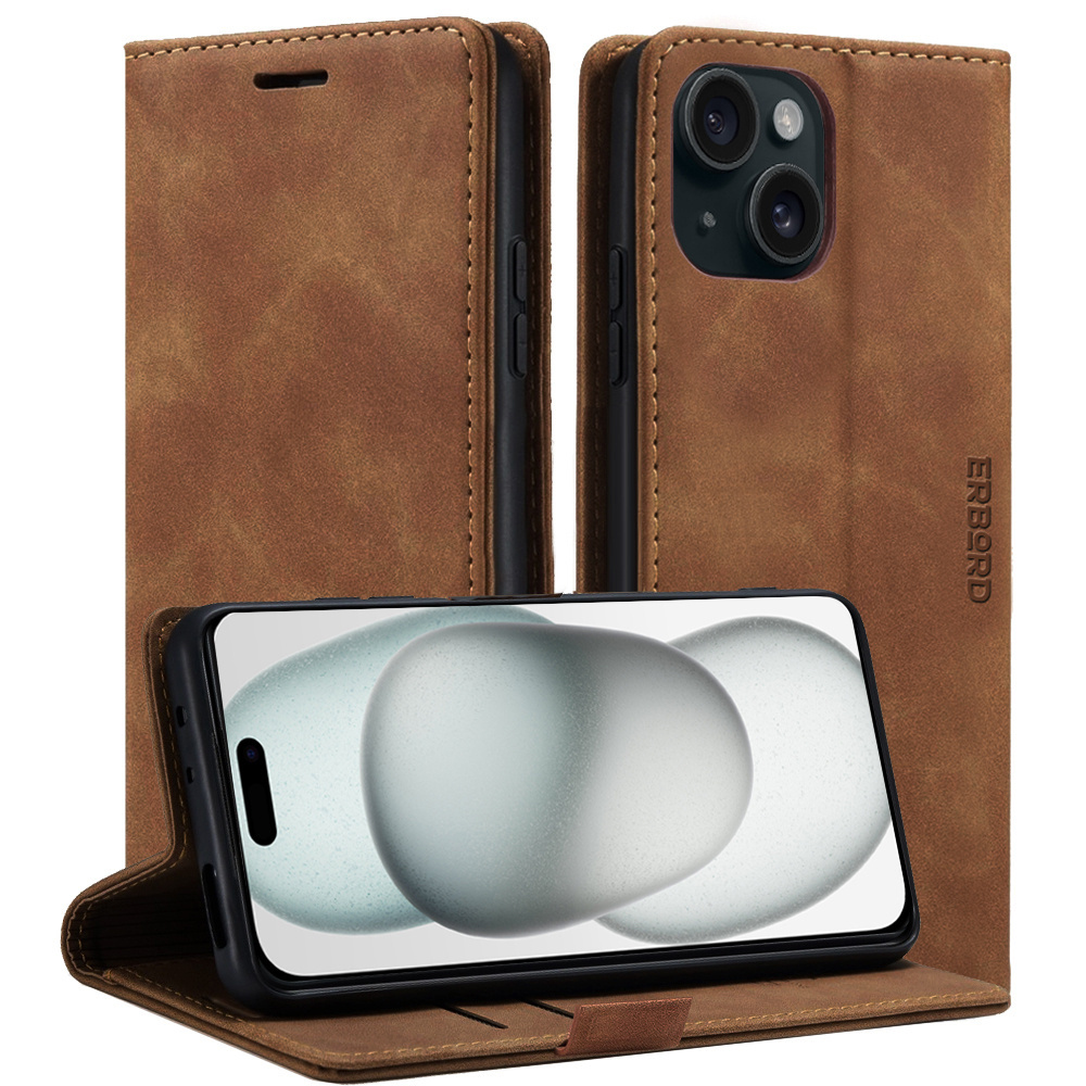 Etui do iPhone 15, ERBORD Vintage, portfel z klapką, brązowe to precyzyjnie wykonany z wysokiej jakości skóry ekologicznej oraz plastiku pokrowiec z klapką. Obudowa jest niezwykle wytrzymała i zapewnia ochronę telefonu z każdej ze stron.
