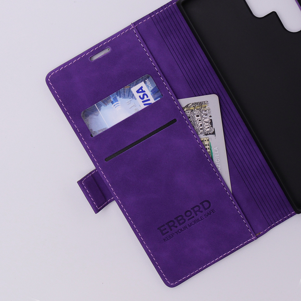 Etui do Samsung Galaxy S24 Ultra, ERBORD Vintage, portfel z klapką, fioletowe to precyzyjnie wykonany z wysokiej jakości skóry ekologicznej oraz plastiku pokrowiec z klapką. Obudowa jest niezwykle wytrzymała i zapewnia ochronę telefonu z każdej ze stron.
