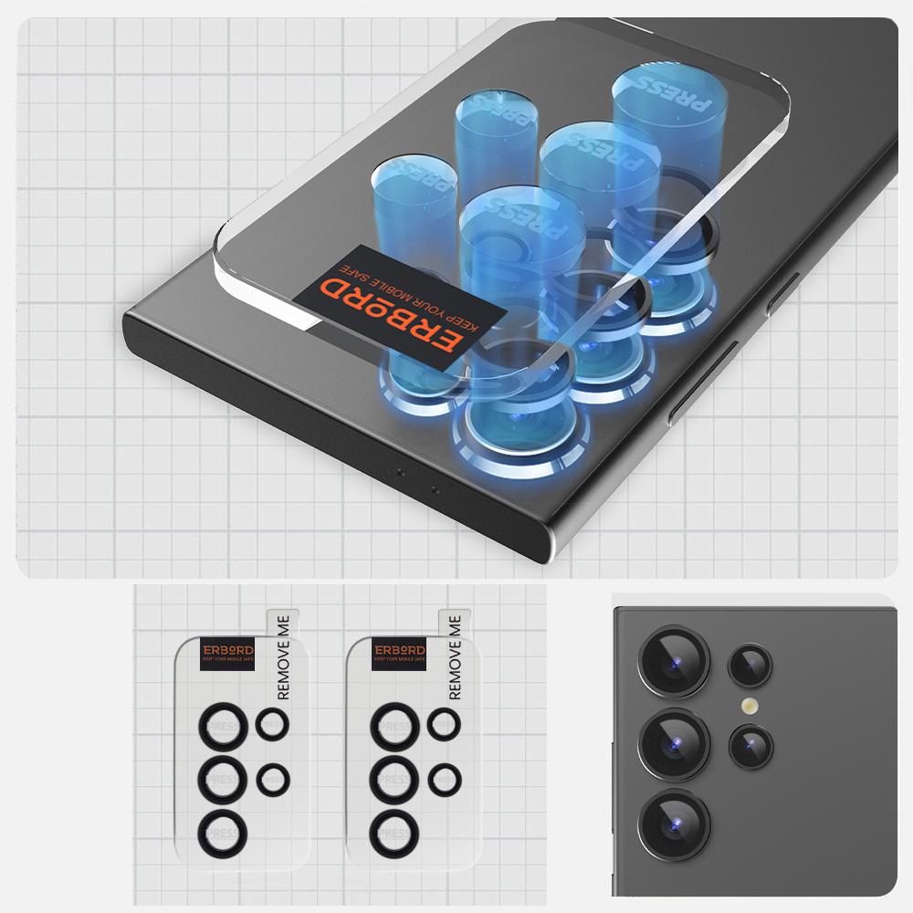- Osłona aparatu telefonu Galaxy S24 Ultra na płytce ułatwiającej montaż szklanych nakładek na obiektywy, w opakowaniu ERBORD umieścił 2 sztuki Easy App Optik Pro.