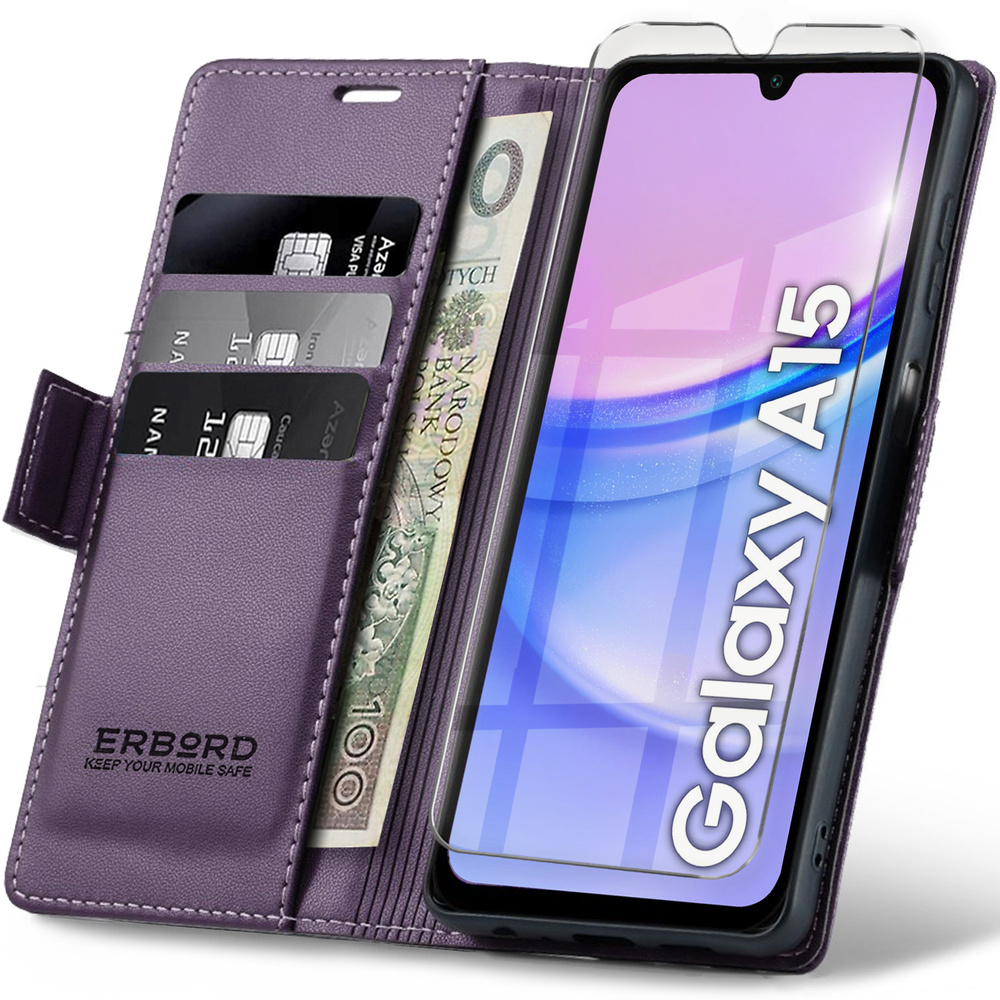 Etui do Samsung Galaxy A15 4G / 5G, ERBORD Glossy Litchi, portfel z klapką, fioletowe + Szkło Hartowane 9H