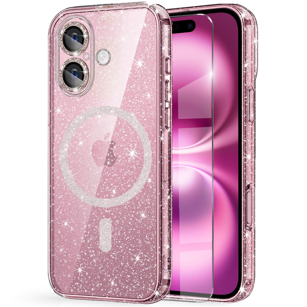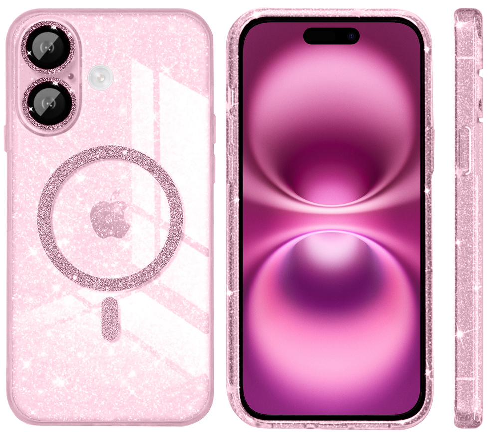 - 1 x Etui do iPhone 16, ERBORD Glitter MagSafe, różowe + Szkło na ekran