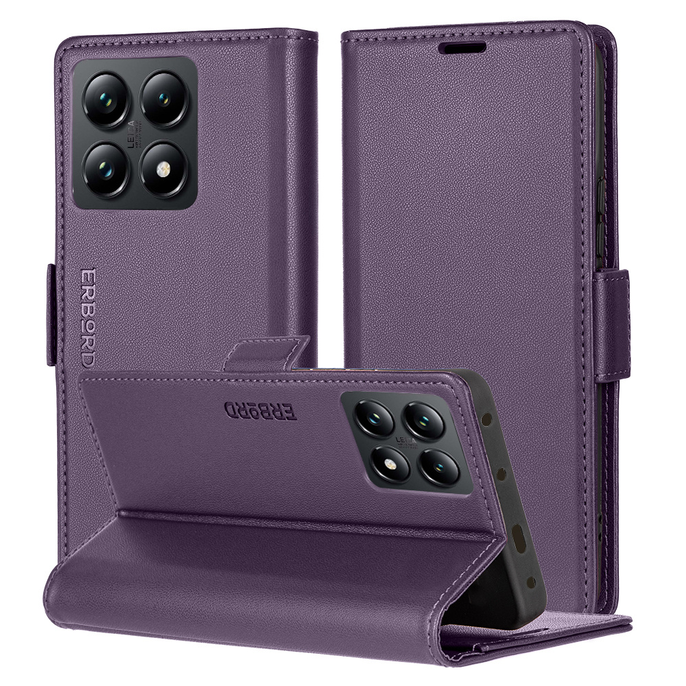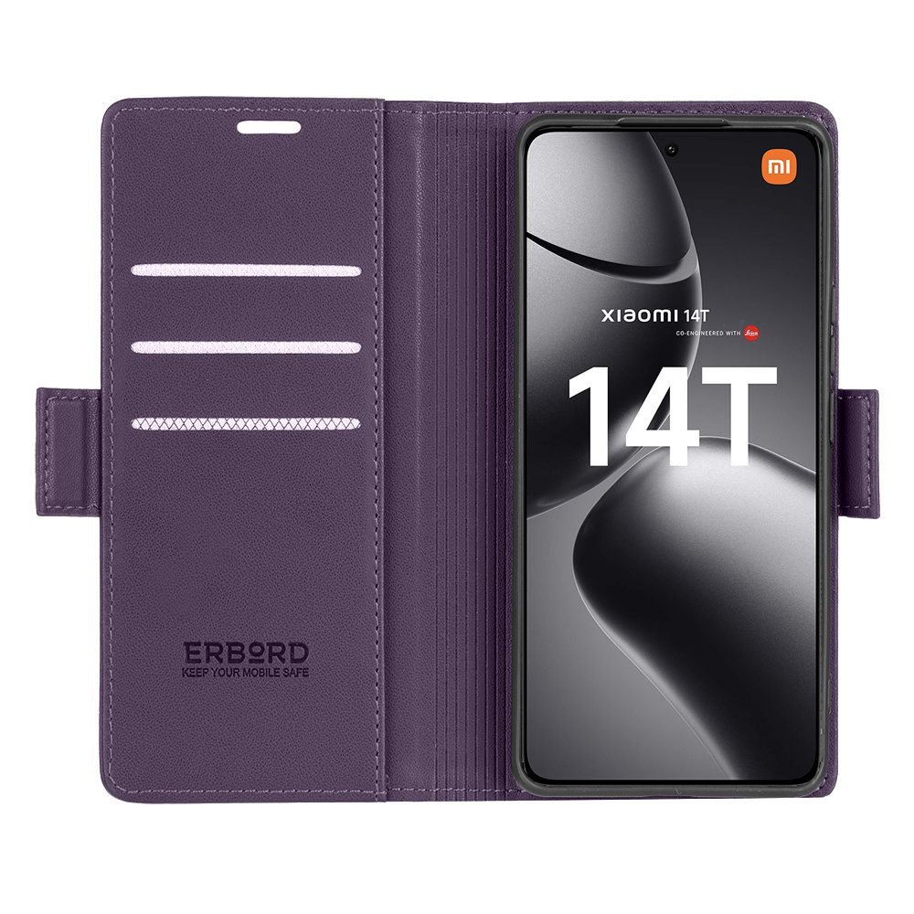 Etui do Xiaomi 14T, ERBORD Glossy Litchi, portfel z klapką, fioletowe to precyzyjnie wykonany z wysokiej jakości skóry ekologicznej oraz plastiku pokrowiec z klapką. Obudowa jest niezwykle wytrzymała i zapewnia ochronę telefonu z każdej ze stron.
