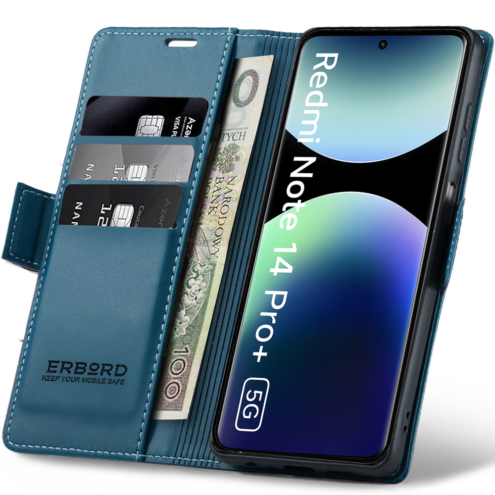 Etui do Xiaomi Redmi Note 14 Pro+ 5G / Xiaomi Poco X7 5G / Xiaomi Redmi Note 14 Pro 5G, ERBORD Glossy Litchi, portfel z klapką, niebieskie to precyzyjnie wykonany z wysokiej jakości skóry ekologicznej oraz plastiku pokrowiec z klapką. Obudowa jest niezwykle wytrzymała i zapewnia ochronę telefonu z każdej ze stron.